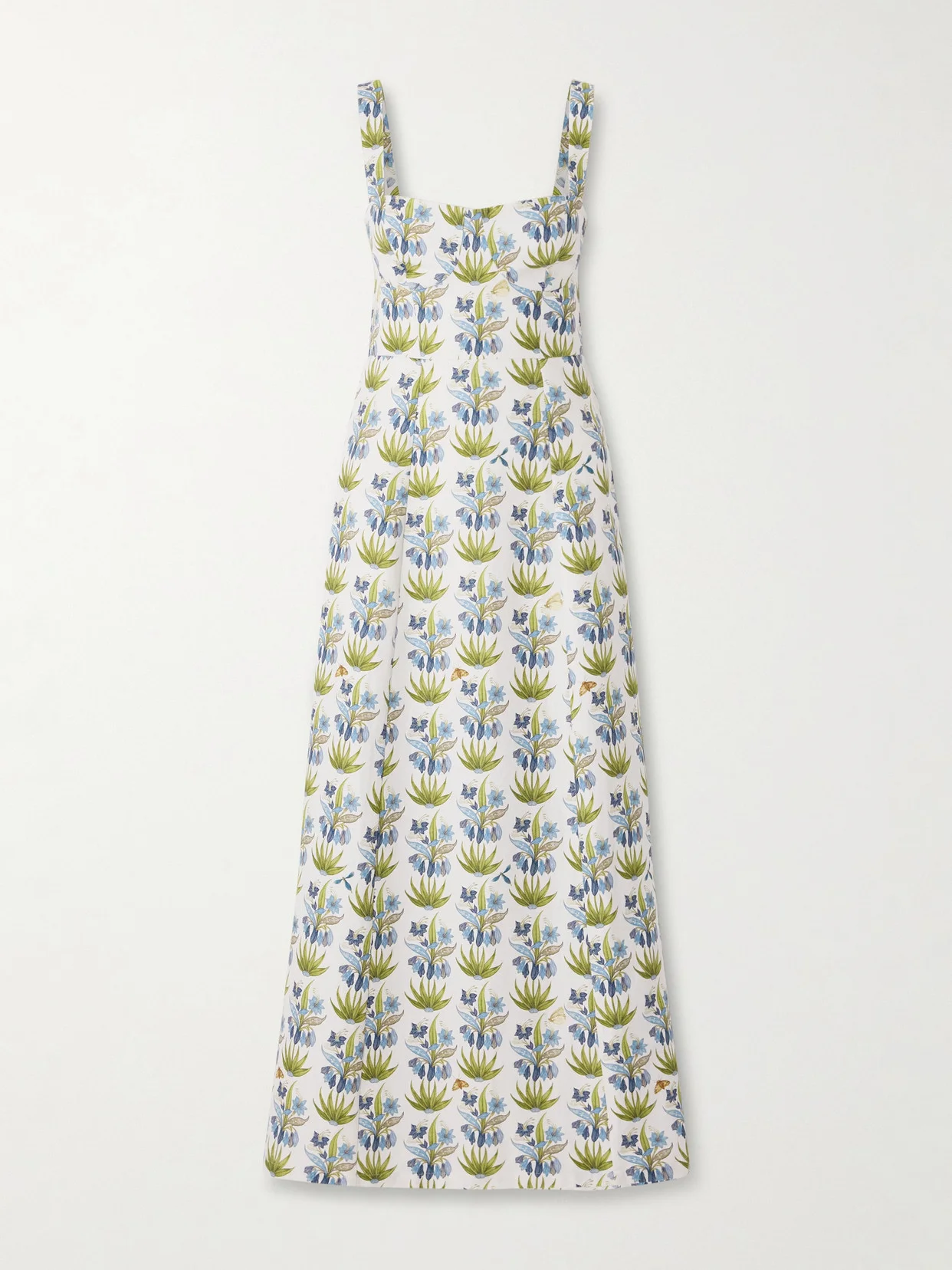 Emporio Sirenuse's 'Azzurra' midi dress returns in a breezy linen-cotton blend, ideal for warm weather. Printed with the floral 'Celestine' motif, it keeps the signature corset-style bodice and dramatic open back that define the silhouette.