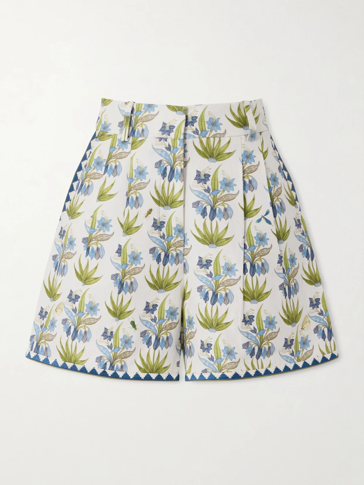 Beatrice Celestine Pleated Floral-print Linen And Cotton-blend Shorts