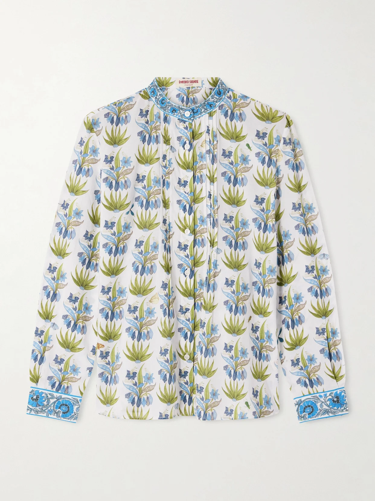 Emporio Sirenuse's 'Chiara' shirt is patterned with a detailed 'Celestine' floral print in pretty shades of blue and green. It's cut from soft cotton-voile in a relaxed shape and has a stand collar and crisp pleats through the front.