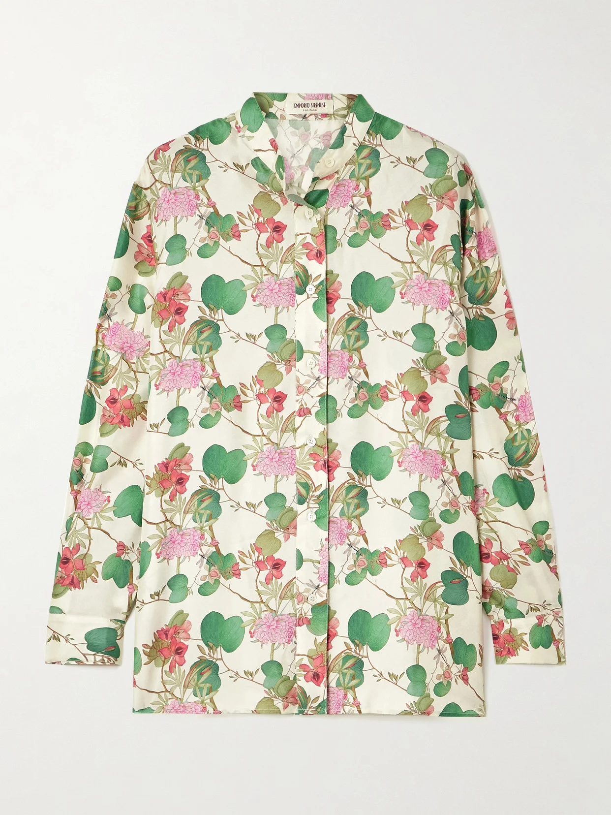 Emporio Sirenuse's shirt is printed with its pretty ‘Dragonfly' pattern that's perfect for warm-weather occasions. It's cut for a loose fit from silk-satin and has buttoned cuffs and a grandad collar. Wear yours with the matching shorts to an al fresco dinner. Responsible Craftsmanship. This product promotes artisanal skills and a brand that invests in communities and adheres to fair-trade principles. Find out more about our NET SUSTAIN criteria here.