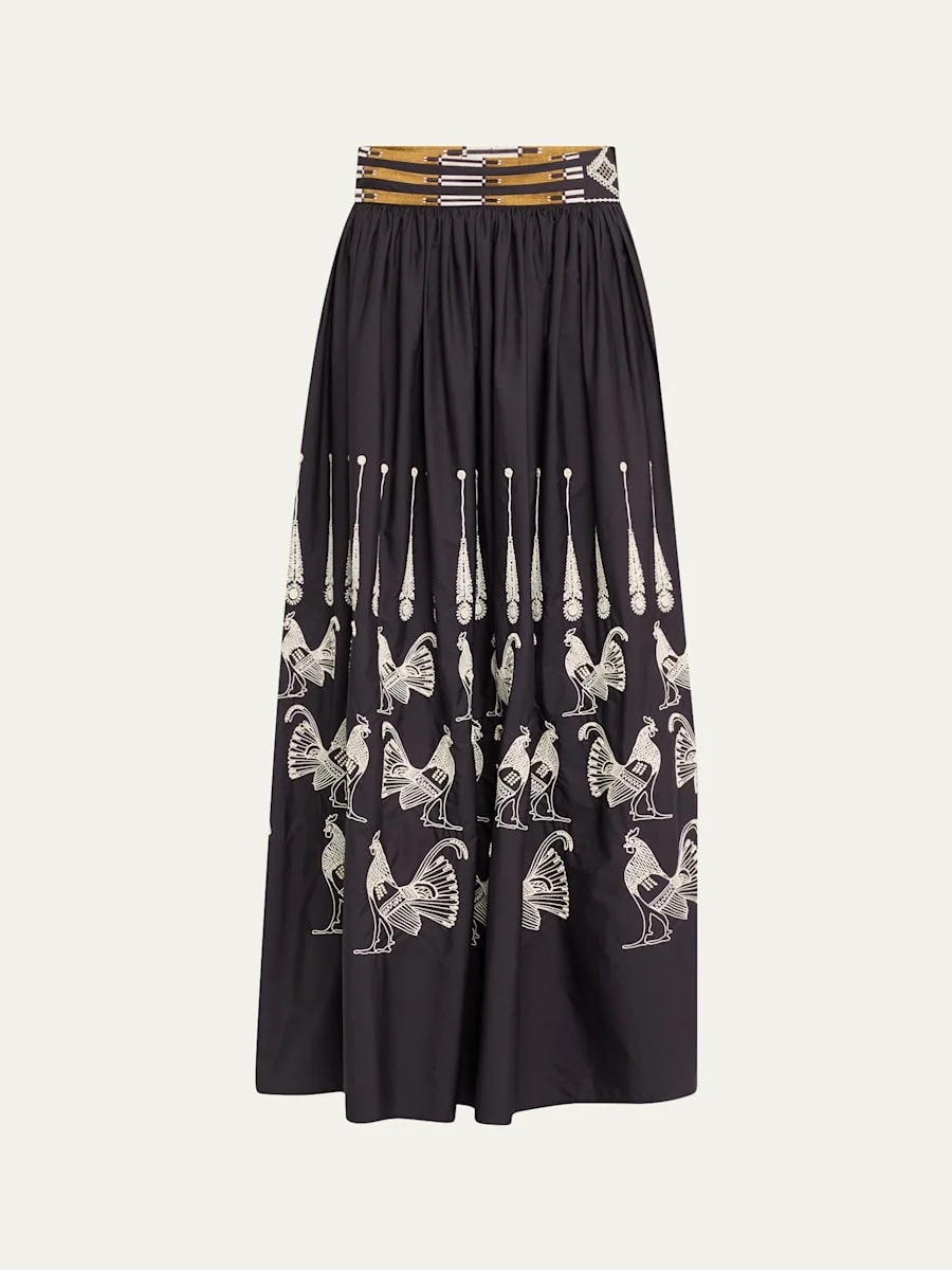 EMPORIO SIRENUSE "Ombretta" ruched maxi skirt with bead-embellished Greek Rooster embroidery Sits high on the hips Embroidered waistband On-seam pockets Ankle length A-line silhouette Invisible side zipper Cotton/polyester Unlined Dry clean Trim: Beading Imported Online Inquiries: BGS21_B9XST| Store Inquiries: #4995986