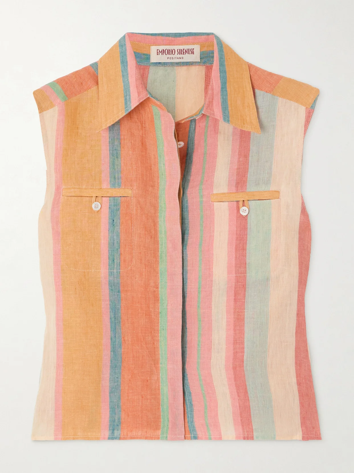 Emporio Sirenuse's collared 'Ylenia' shirt exudes bohemian charm with its colorful stipes and breezy design. It's been made in a small Mumbai workshop from linen and has a concealed placket and buttoned welt pockets. Wear yours with sandals and the matching pants. Responsible Craftsmanship. This product promotes artisanal skills and a brand that invests in communities and adheres to fair-trade principles. Find out more about our NET SUSTAIN criteria here.