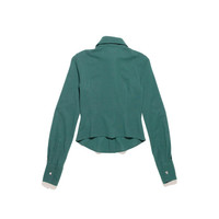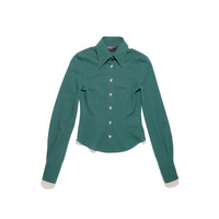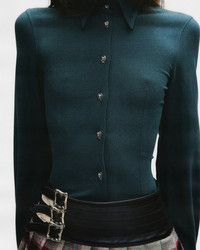 LONG SLEEVE BUTTON FRONT SHIRT IN ITALIAN WOOL BLEND. POINTED SHIRT COLLAR. CUSTOM CAST CHERUB BUTTONS. MADE IN ITALY. SHIPS IN 1-2 WEEKS