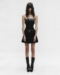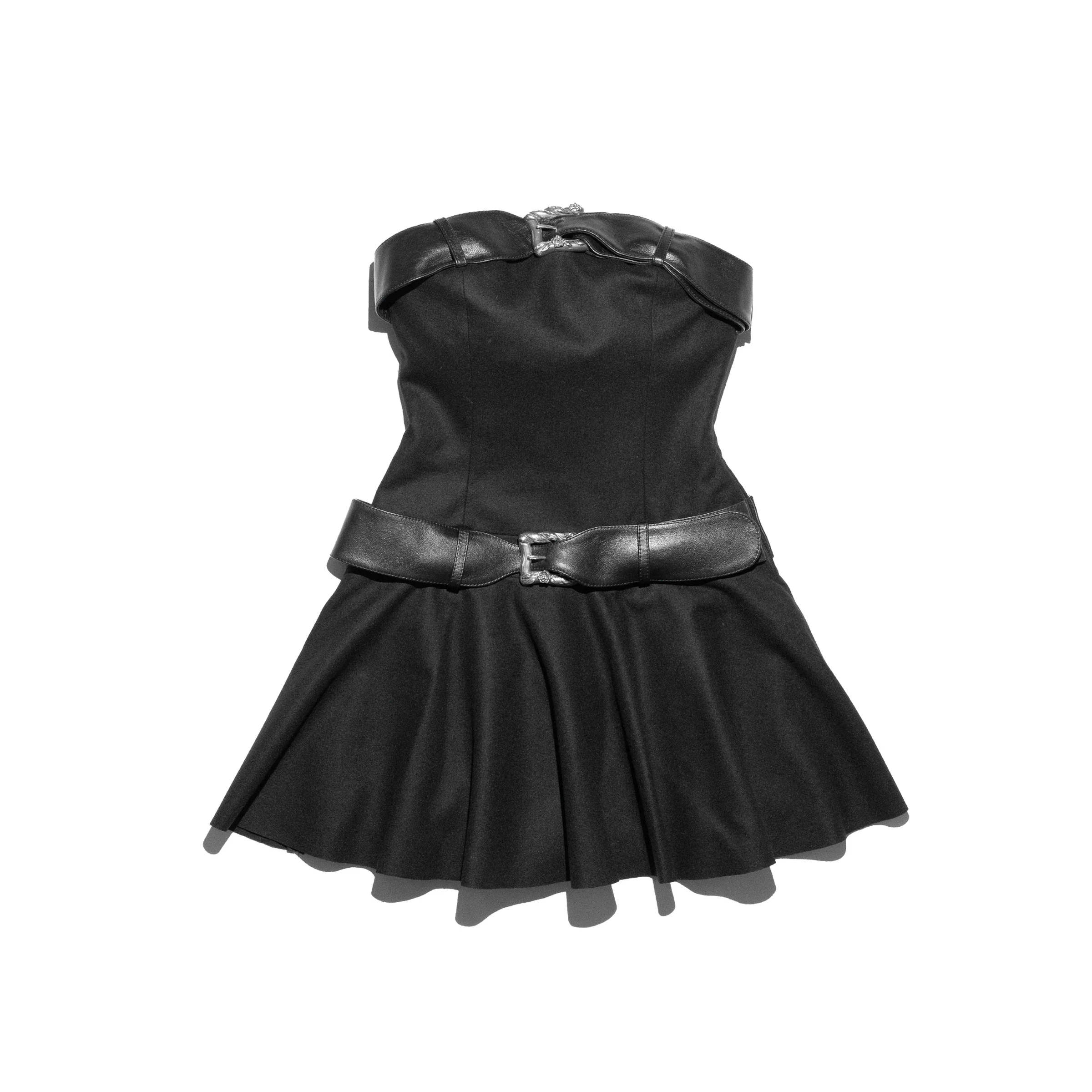 STRAPLESS MINI DRESS IN CASHMERE. LAMBSKIN BELT DETAIL AT BUST & WAIST. SIGNATURE WHITE BRONZE BUCKLE CLOSURES. MADE IN ITALY.