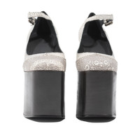 MONITOR LIZZARD LEATHER MARY JANE PLATFORM HEELS. PIN-BUCKLE STRAP AT ANKLE. WINGTIP APPLIQUE AT SQUARE TOE. CARVED WOODEN BLOCK HEEL. MADE IN ITALY.