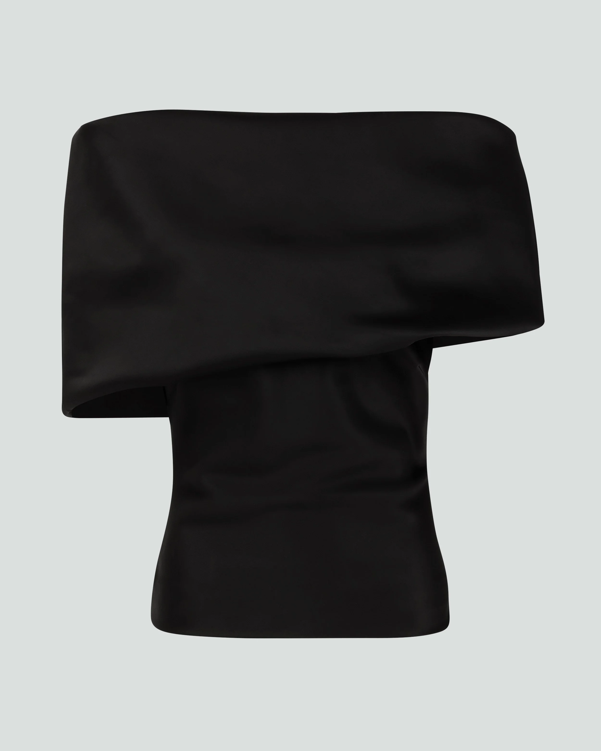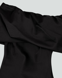 - DOUBLE SATEEN - 97% POLYESTER 3% SPANDEX - SIDE SEAM YKK INVISIBLE ZIPPER - SHAPING DARTS - DRAPED OFF SHOULDER NECK LINE - FULLY LINED