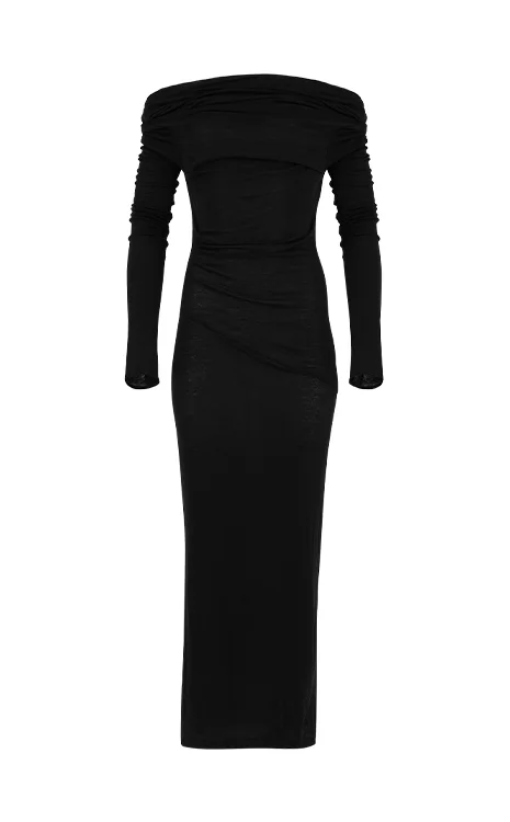 - 94% cotton 6% elastane - Sheer look - 115gsm - Draped neckline - Gathering and tuck detail - Midi length