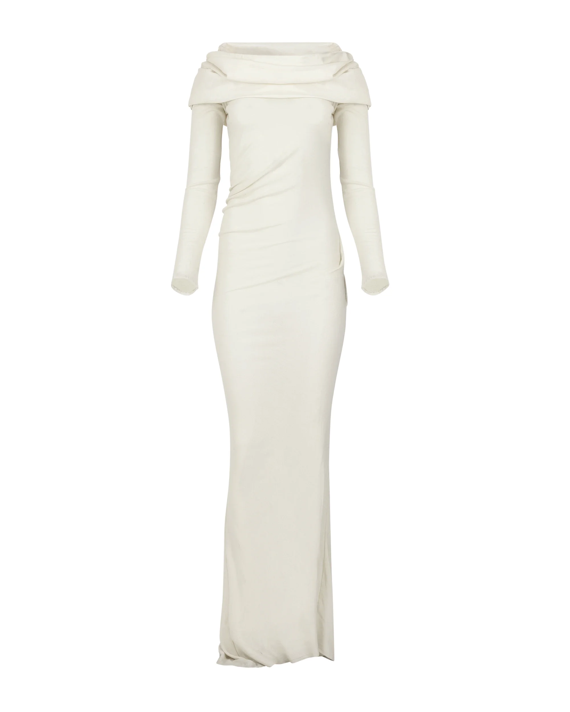 - 100% WOOL - CONTRAST COTTON NECK DRAPE - PLEAT DETAILING - FORM FITTED - FLOOR LENGTH - BACK VENT