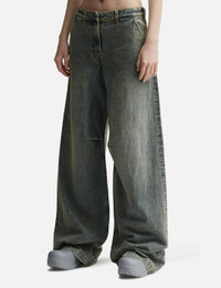 - Entire Studios - Dem Jeans - Made with 13.75 oz Japanese selvage denim - Two side pockets; two back pockets - YKK zip fly with concealed button closure - Inner leg dart - Wide leg - Color: Surface Wave - Material: 100% Cotton - See more Pants and Clothing SIZING - Model wears size S - Model measures: Height 175cm, Chest 32’/81cm, Waist 24.5’’/61.2cm, Hip 35’’/88.9cm