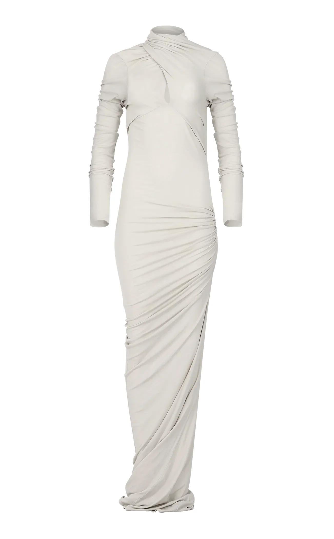 - 94% COTTON 6% ELASTANE - DRAPED DRESS - PLEAT AND GATHERING DETAILING - FORM FITTED - HIGH NECK - FLOOR LENGTH - SLIGHT BACK TRAIN