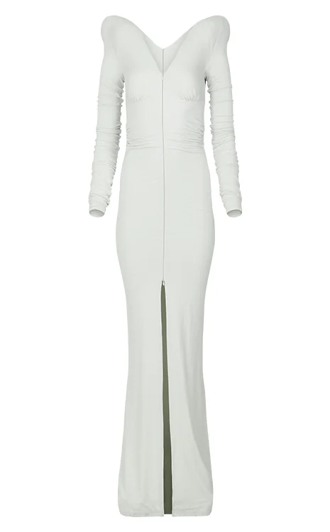 - Final sale NO RETURNS/ EXCHANGES ON SALE ITEMS. PLEASE CHOOSE CAREFULLY. - 92% viscose 8% elastane jersey - Polyester fill shoulder pads and boning - Front split - Waist and bust darts - YKK invisible zip front