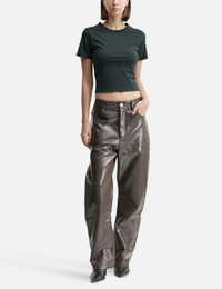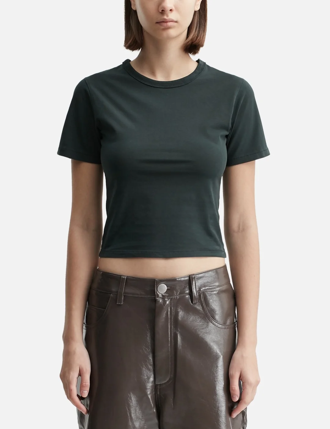 - Entire Studios - Micro T-shirt - Enzyme washed organic cotton jersey exterior - Vintage finish - Ribbed crewneck - Cropped length - Colors will vary for pieces in washed black due to the heavy wash process - Color: Tar - Material: 95% Organic Cotton, 5% Spandex - See more T-Shirts and Clothing SIZING - Model wears size M - Model measures: Height 186cm, Chest 34”/86cm, Waist 28”/71cm, Hip 36”/91cm