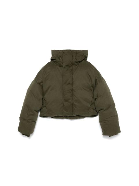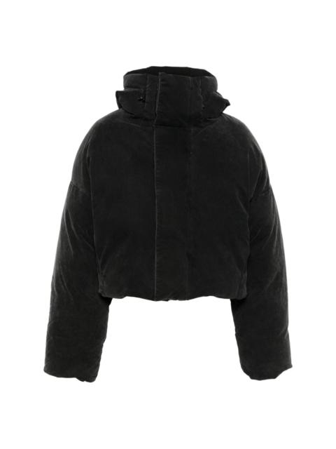 hooded puffer jacket Highlights - Black - Cotton - Twill weave - Faded effect - Padded design - Duck down-feather filling - Drawstring hood - Concealed front zip fastening - Front touch-strap fastening - Funnel neck - Drop shoulder - Extra-long sleeves with ribbed cuffs - Internal zip-fastening pocket - Full lining - Straight hem - When buying this unisex item, keep in mind that it is graded in standard men's sizing. Imported Composition Lining: Cotton 100%, Duck Down 90%, Duck Feathers 10% Outer: Cotton 100% SIZE & FIT Model measurements Height 5 ft 10 in(1.78 m) Bust/Chest 31.49 in(80 cm) Hips 37 in(94 cm) Waist 23.62 in(60 cm) Measurement SLEEVE LENGTH 22.44 in(57 cm) LENGTH 22.83 in(58 cm) WAIST 55.11 in(140 cm) BUST 55.9 in(142 cm) Shoulder Width 31.1 in(79 cm) FittingInformation This piece is unisex – if you usually select men's sizing expect a loose fit throughout; if you usually select women's sizes, expect an oversized fit Made from a padded non-stretch fabric, giving it no natural elasticity Washing instructions Hand Wash