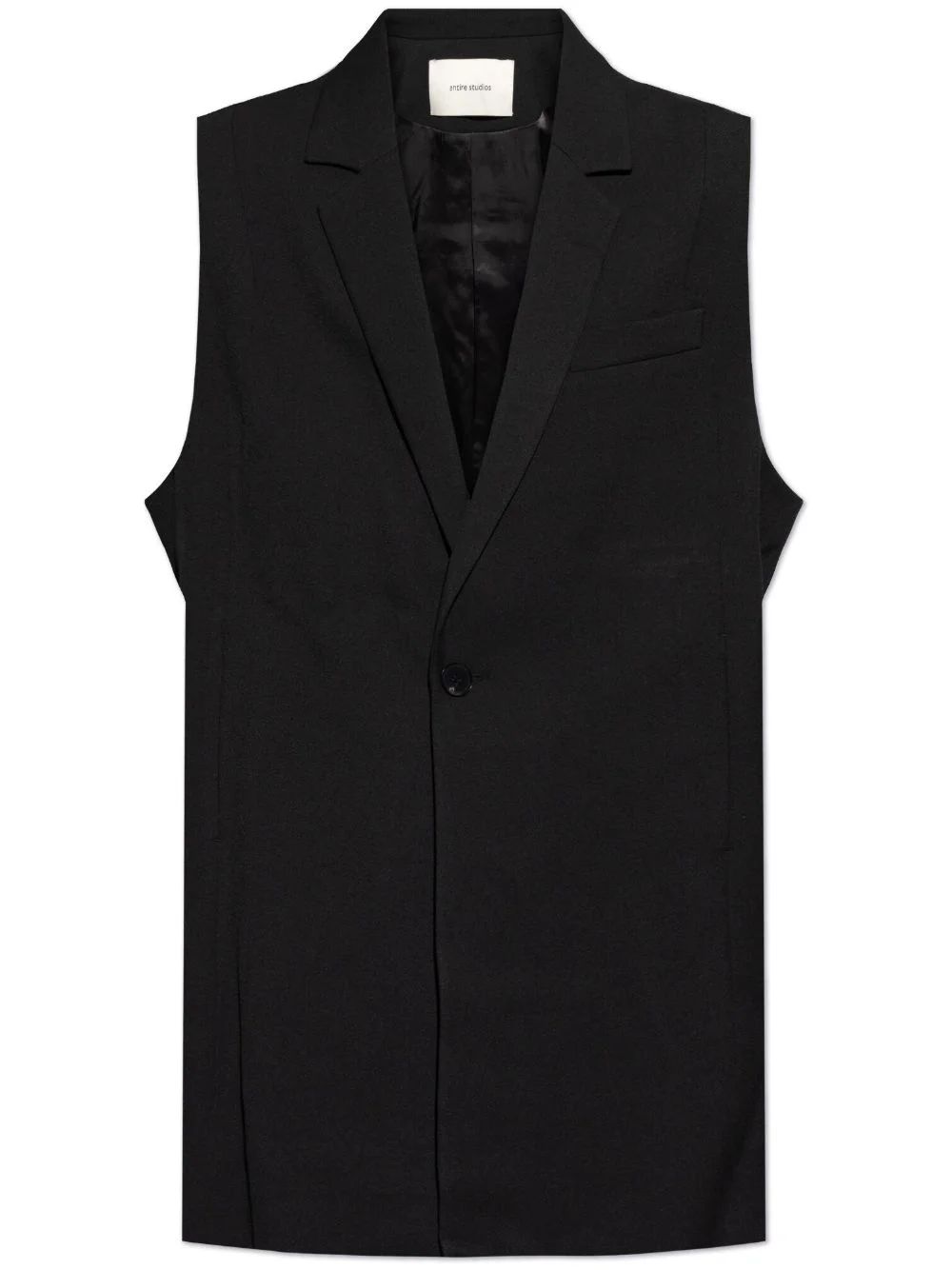 plateau vest Highlights - Black - Front button fastening - Notched lapels - Sleeveless - Two side inset pockets - When buying this unisex item, keep in mind that it is graded in standard men's sizing. Imported Composition Viscose 69%, Wool 30%, Lycra 1% SIZE & FIT FittingInformation Designed to be unstructured, offering a loose fit throughout Made from a midweight non-stretch fabric