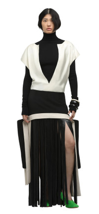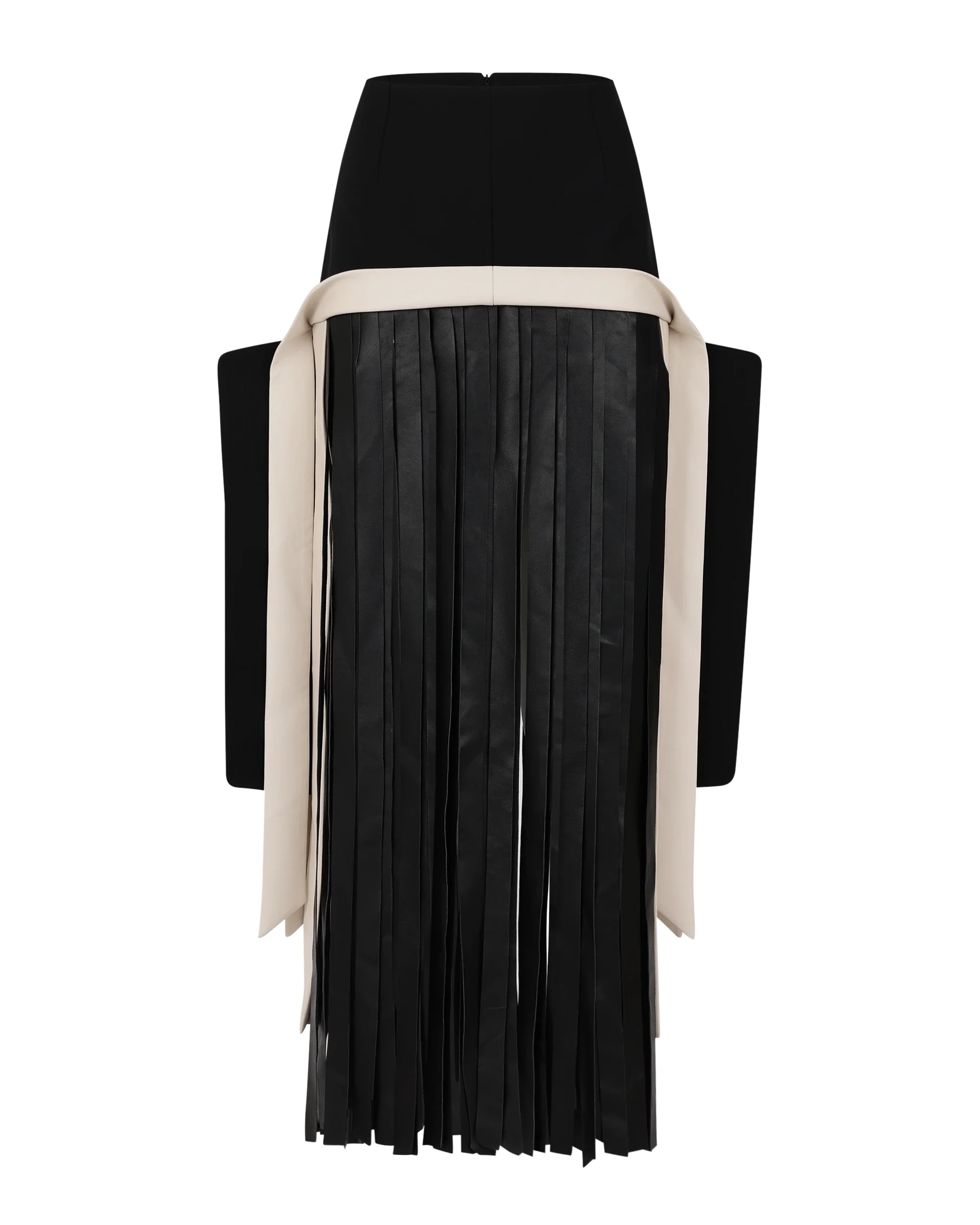 - 40% WOOL, 57% POLEYSTER, 3% LYCRA - FITTED SKIRT - GENUINE LEATHER FRINGING - FULLY LINED - YKK INVISIBLE ZIPPER