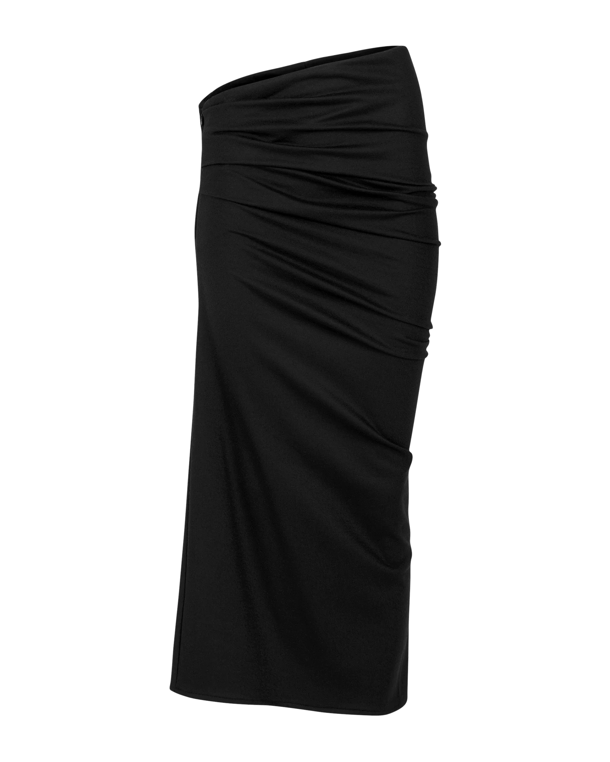 - 100% STRETCH WOOL - DRAPED SKIRT - PLEAT DETAILING - FORM FITTED - MIDI LENGTH - BACK SPLIT - YKK INVISIBLE ZIPPER