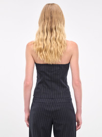 ENTIRE STUDIOS top in navy, paneled construction, pinstripe pattern, straight neckline, strapless, side concealed zip closure, straight hem, slim fit. Standard Sizing Model is 5'8" wearing size S. Bust: 31" Waist: 23.5" Hips: 34"