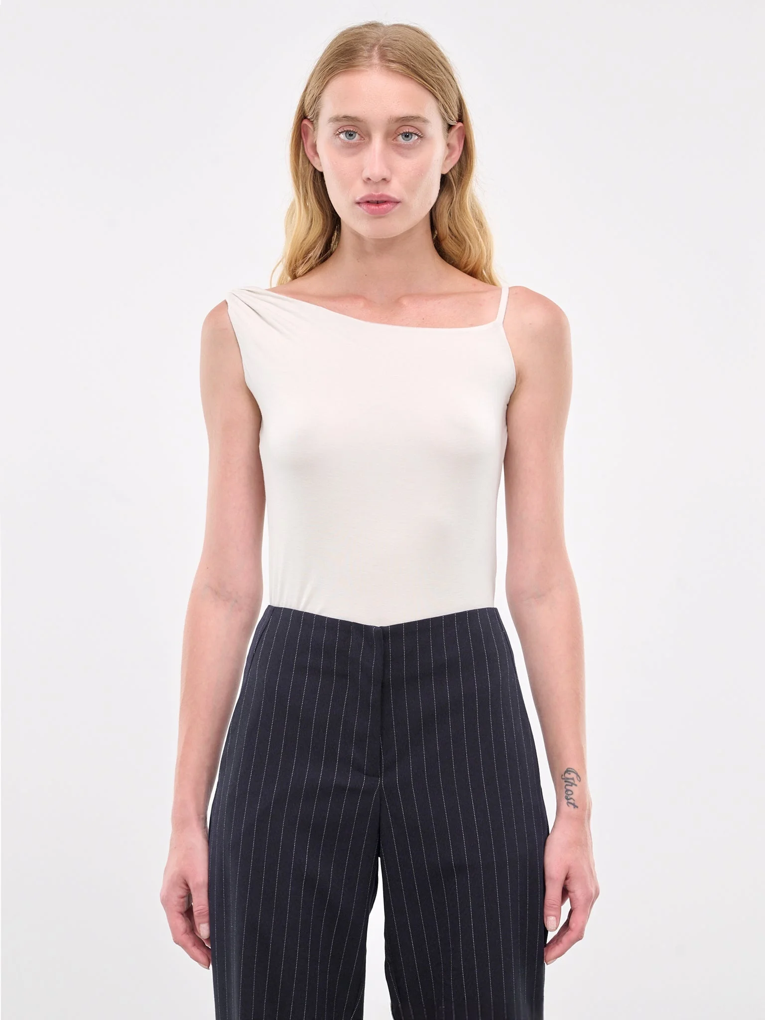 ENTIRE STUDIOS bodysuit in rice, paneled construction, asymmetric neckline, spaghetti strap & twisted strap, sleeveless, armscyes, open back, back draping, high-cut, form fit. Standard Sizing Model is 5'8" wearing size S. Bust: 31" Waist: 23.5" Hips: 34"