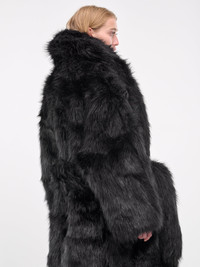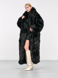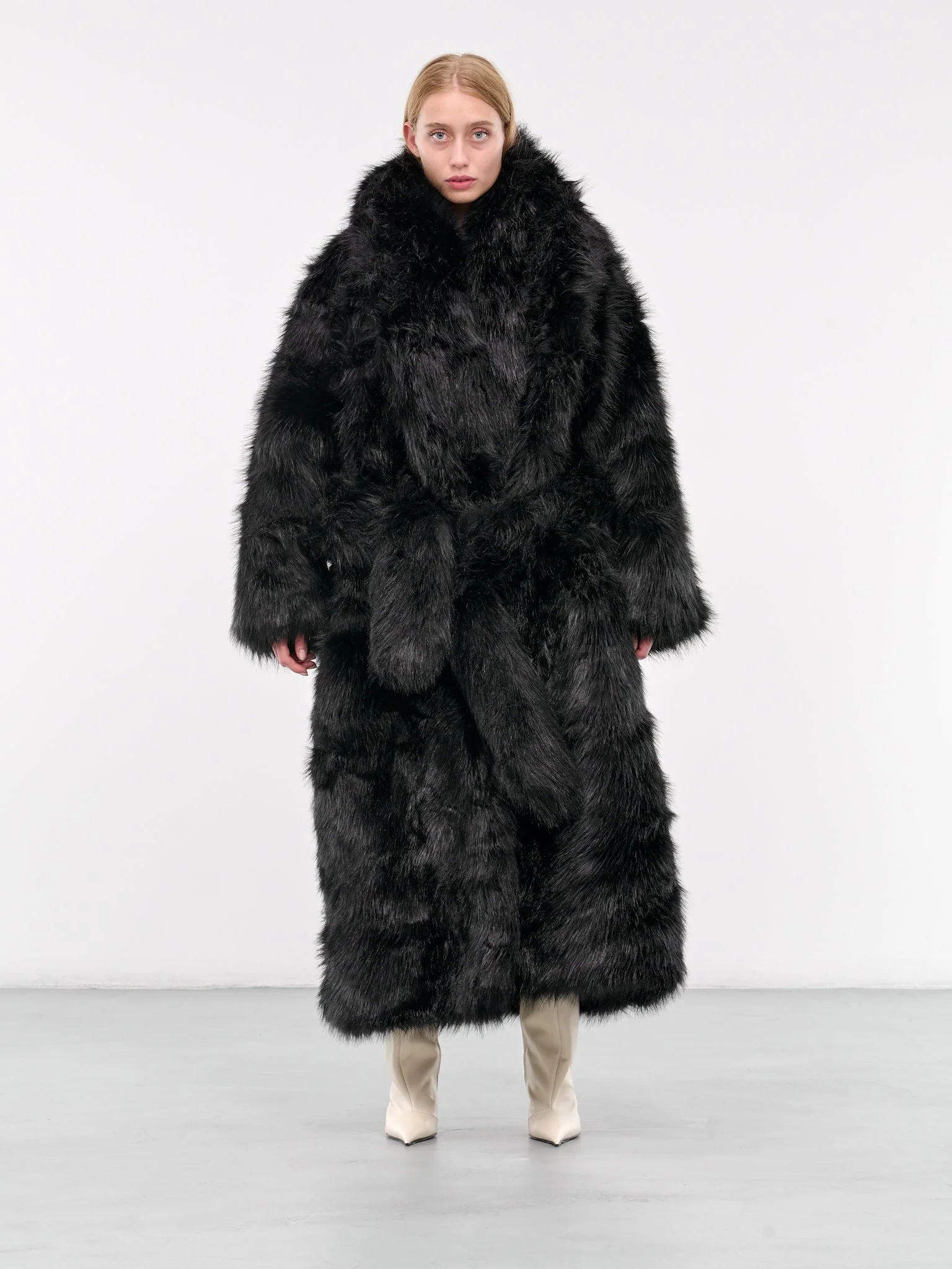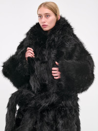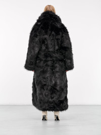ENTIRE STUDIOS coat in black, paneled faux fur construction, shawl collar, front closure, dropped shoulders, long sleeves, waist self-tie belt fastening, straight hem, maxi-length, oversized fit. Standard Sizing Model is 5'8" wearing size S. Bust: 31" Waist: 23.5" Hips: 34"