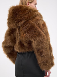 ENTIRE STUDIOS jacket in brown, paneled faux fur construction, hood, front closure, dropped shoulders, long sleeves, high-low hem, cropped length, oversized fit. Standard Sizing Model is 5'8" wearing size S. Bust: 31" Waist: 23.5" Hips: 34"