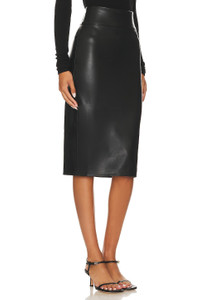 - 50% polyester 50% polyurethane - Made in USA - Do not wash - Wipe with washcloth - .Unlined - Hidden back zipper closure - Faux leather fabric with back slit - Skirt measures approx 28.5" in length - Revolve Style No. ENZA-WQ68 - Manufacturer Style No. LM6078