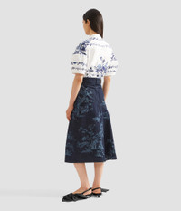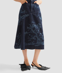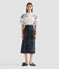 This A-line skirt is crafted with an asymmetric panel. The indigo denim is decorated with a etching-inspired trees. - A-line silhouette - Partially lined - Midi length - Centre front button and zip fly fastening - Five pockets - Product code: PF25_DES3_60024009 Fits true to size with a tailored fit through the body. Fabric and Care 100% Cotton. Lining: 100% Cotton. Dry clean.