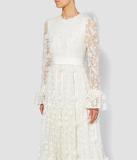 The ultimate in romantic wedding day dressing, the Alvaro Gown is crafted from cutwork organza that’s detailed with 3D flowers. This ivory, floor-length dress has sheer sleeves with ruffled cuffs and a grosgrain belt at the waist. The tiered skirt creates a frothy, feminine feel. Size and Fit Model is 5'9" and wears a size 8 US size 4 / UK size 8 measurements: Bust 91cm Waist 72cm Hips 110cm Length 164cm Fabric and Care 100% Silk. Lining:71% Acetate, 29% Viscose. Do Not Machine Wash / Delicate Dry Clean / Do Not Bleach / Do Not Tumble Dry / Cool Iron on Reverse / Cover All Buttons and Garment Accessories Before Cleaning.