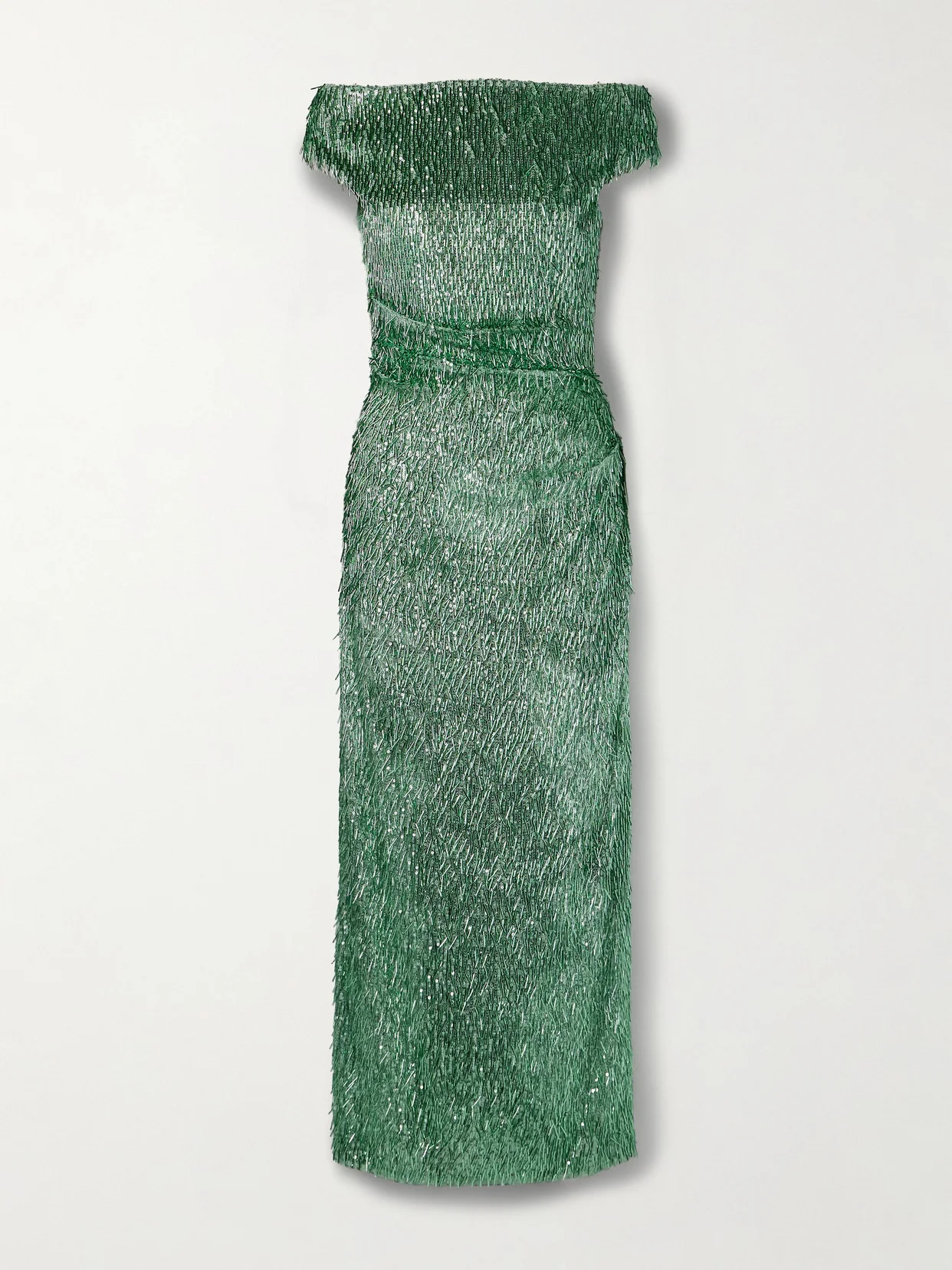 Erdem's Fall '25 collection balances playful elegance with artistic texture-this midi dress is inspired by crayon strokes. Made from tulle, it's hand-embellished with beads and sequins for a soft shimmer and has an off-the-shoulder neckline. The satin lining ensures a smooth, comfortable fit.