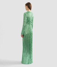 Draped at the neckline and falling to a floor-length hem, this green dress is covered in thousands of sequins and bugle beads. - Slim silhouette - Fully lined - Floor length - Draped neckline - Long sleeves - Centre back hook, eye, and concealed zip fastenings - Product code: AW25_G44_50653009 Fits true to size. Fabric and Care Main: 95% Polyester, 5% Elastane. Sequins: 100% PET. Lining: 100% Silk. Dry clean.