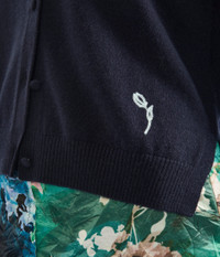 This classic-fit cardigan is knitted from navy cashmere. It is embroidered with a single flower at the hem. - Classic fit - Lightweight knit - Crew neck - Long sleeves - Centre front button fastenings - Ribbed cuffs and hem - Product code: AW25_KT33_30124001 Fits true to size. Model is 5'11½ (181cm) and wears a size S. Fabric and Care 100% Cashmere. Dry clean.