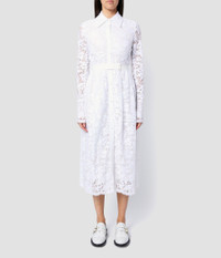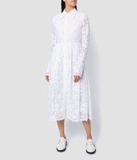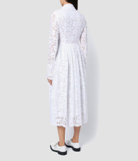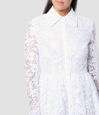 The Corinne Dress is cut from ivory lace that showcases romantic flowers and leaves. It has a point collar, long sleeves, and a feminine, flared skirt. Undo a couple of buttons at the neck for a more relaxed mood during your wedding reception. Size and Fit Model is 5'10" and wears a size 8 US size 4 / UK size 8 measurements: Bust 94cm Waist 78cm Hips 180cm Shoulders 38.8cm Length 124cm Fabric and Care 79% Cotton, 21% Polyamide. Lining: 100% Silk. Do Not Machine Wash / Delicate Dry Clean / Do Not Bleach / Do Not Tumble Dry / Cool Iron on Reverse.