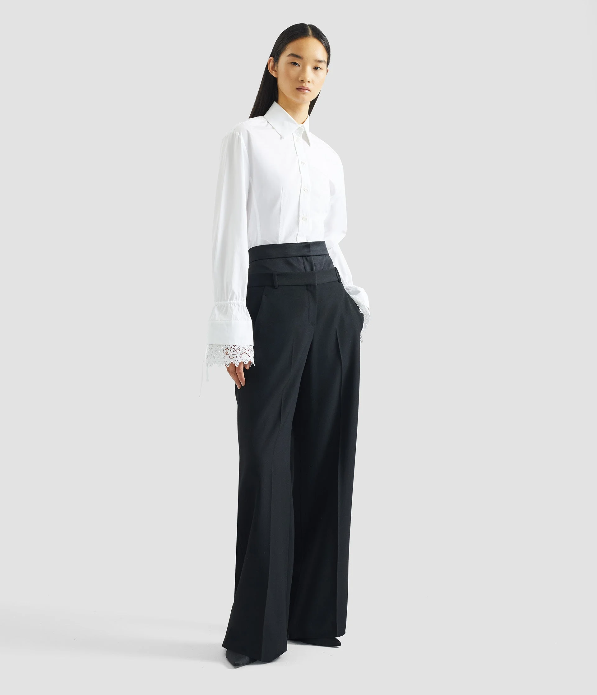 Inspired by the mood of the Dutch masters, this white cotton shirt has a fitted waist and longline curved hem. The sleeves have gathered cuffs with ties and delicate lace trims. - Longline silhouette - Shirt collar - Long sleeves with lace cuffs - Centre front button fastenings - Product code: PS26_T54_40029000 If in between sizes, recommend sizing down.Model is 5'10" (178cm) and wears size UK 8. Fabric and Care 100% Cotton, Trim: 100% Cotton. Dry clean.