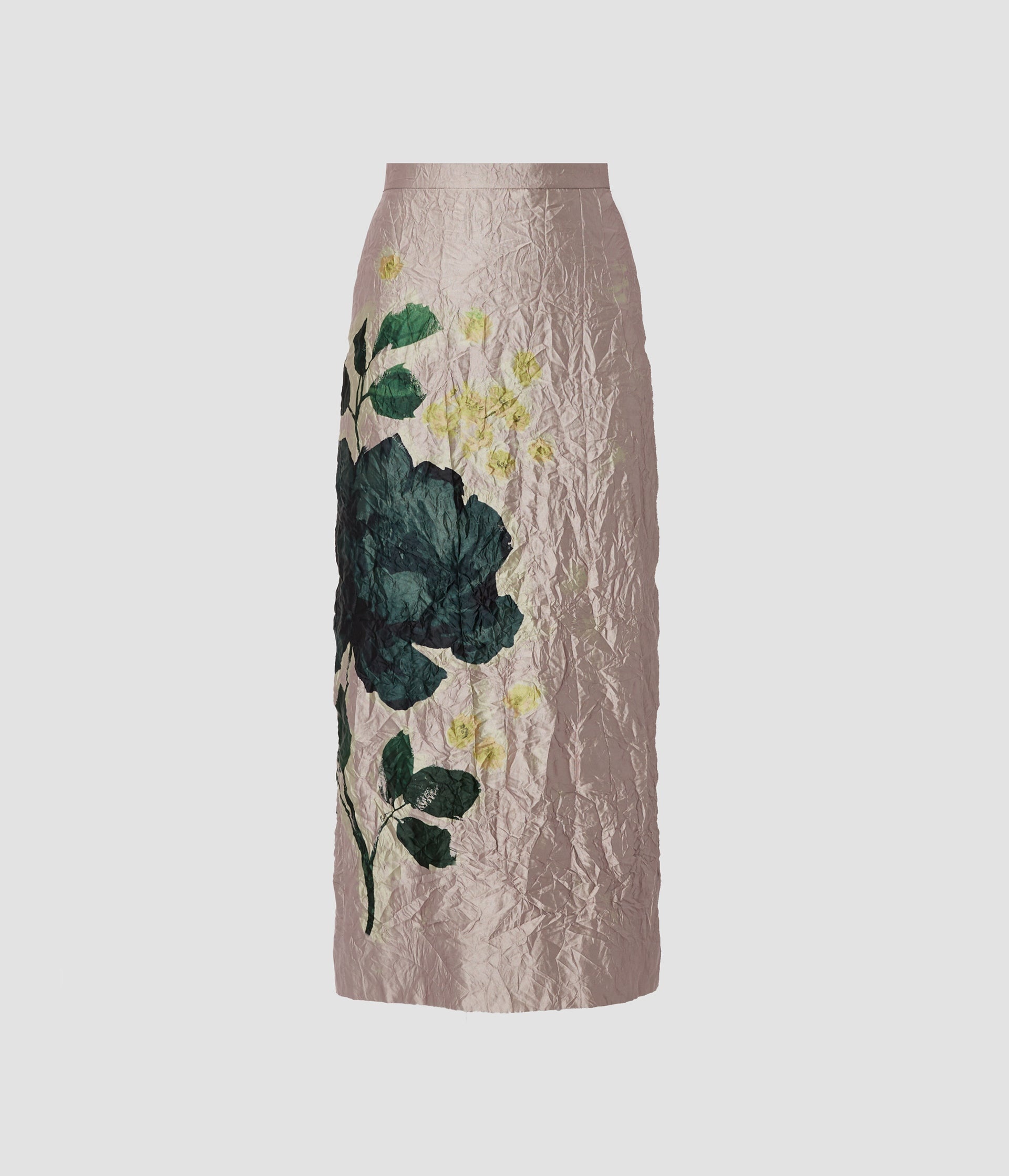 This pencil skirt is crafted from metallic lilac textured satin. It provides a striking base for a supersized depiction of the season’s 1930s-inspired Margot Floral. Wear it with a simple knit for the chicest take. Size and Fit This mid-length pencil skirt has a centre back vent. It has hook, eye, and invisible zip fastenings at the centre back, and is fully lined in lilac silk crepe de chine. Fits true to size. Fabric and Care 94% Polyester, 6% Metal. Lining: 100% Silk. Dry Clean.