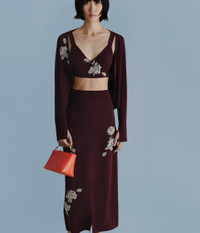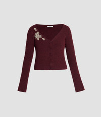 With a deep V-neck and long, split-cuff sleeves, this burgundy cardigan is embroidered with outlines of flowers and embellished with crystals. - Fitted silhouette - Lightweight knit - V-neck - Long sleeves with split cuffs - Centre front button fastenings - Crystal embroidery - Product code: PF25_KT18_30015002 Fits true to size.Model is 5'10" (178cm) and wears a size UK M. Fabric and Care 59% Polyester, 23% Viscose, 10% Wool Merino, 5% Cashmere, 3% Elastane. Embroidery: 40% Brass, 40% Glass, 20% Nylon. Dry clean.
