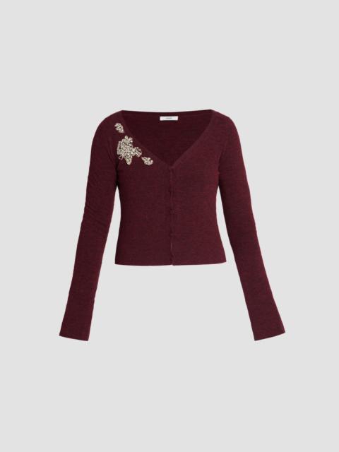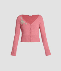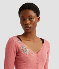 With a deep V-neck and long, split-cuff sleeves, this rose-pink cardigan is embroidered with outlines of flowers and embellished with crystals. - Fitted silhouette - Lightweight knit - V-neck - Long sleeves with split cuffs - Centre front button fastenings - Crystal embroidery - Product code: PF25_KT18_30015007 Fits true to size. Fabric and Care 59% Polyester, 23% Viscose, 10% Wool Merino, 5% Cashmere, 3% Elastane. Embroidery: 40% Brass, 40% Glass, 20% Nylon. Dry clean.