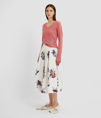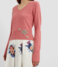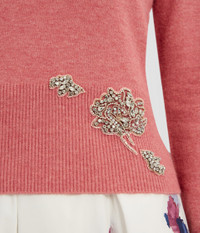Knitted for a slim silhouette, this pink, cropped sweater has a V-neck and long sleeves. It is decorated with crystal embroidery depicting flowers. - Fitted silhouette - Lightweight knit - V-neck - Long sleeves with split cuffs - Crystal embroidery - Product code: PF25_KT17_30015007 Fits true to size.Model is 5'10" (178cm) and wears a size UK S. Fabric and Care 59% Polyester, 23% Viscose, 10% Wool Merino, 5% Cashmere, 3% Elastane. Embroidery: 40% Brass, 40% Glass, 20% Nylon. Dry clean.