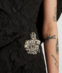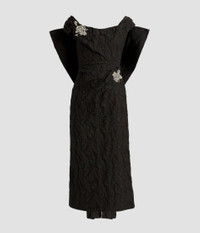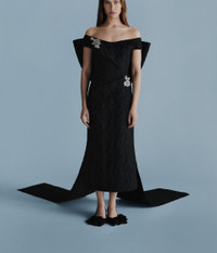 This evening gown is crafted from black embroidered cloque jacquard and features an oversized, trailing tulle bow. It has crystal patches at the neckline and hip. - Slim silhouette - Fully lined - Midi length - Off the shoulder - Sleeveless - Centre back hook, eye, and concealed zip fastenings - Tulle bow at back - Product code: PF25_D120_80031000 Fits true to size.Model is 5'10" (178cm) and wears a size UK 8. Fabric and Care Main: 83% Polyester, 17% Polyamide. Secondary: 77% Polyamide, 23% Elastane. Lining: 100% Silk. Embroidery: 40% Brass, 20% Stone, 20% Metal, 20% Tulle.