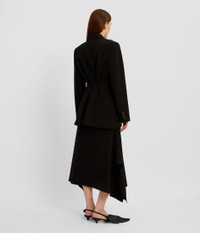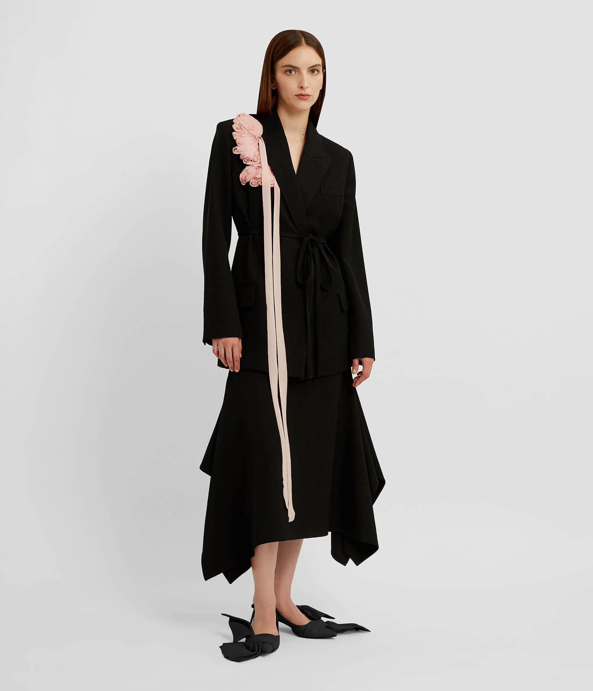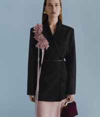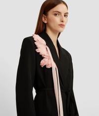 Cut for an oversized, unstructured silhouette, this single-breasted jacket ties at the waist. It is decorated with blush pink silk ribbon applique flowers. - Relaxed silhouette - Lapel collar - Hidden tie fastening - Long sleeves - Welt pocket and flap-front jet pockets - Centre back vent - Fully lined - Product code: PF25_J8_70031000 Fits true to size.Model is 5'10" (178cm) and wears a size UK 8. Fabric and Care 100% Virgin Wool. Lining:100% Cupro Bemberg. Decoration: 50% Silk, 50% Nylon. Dry clean.