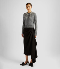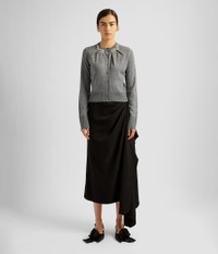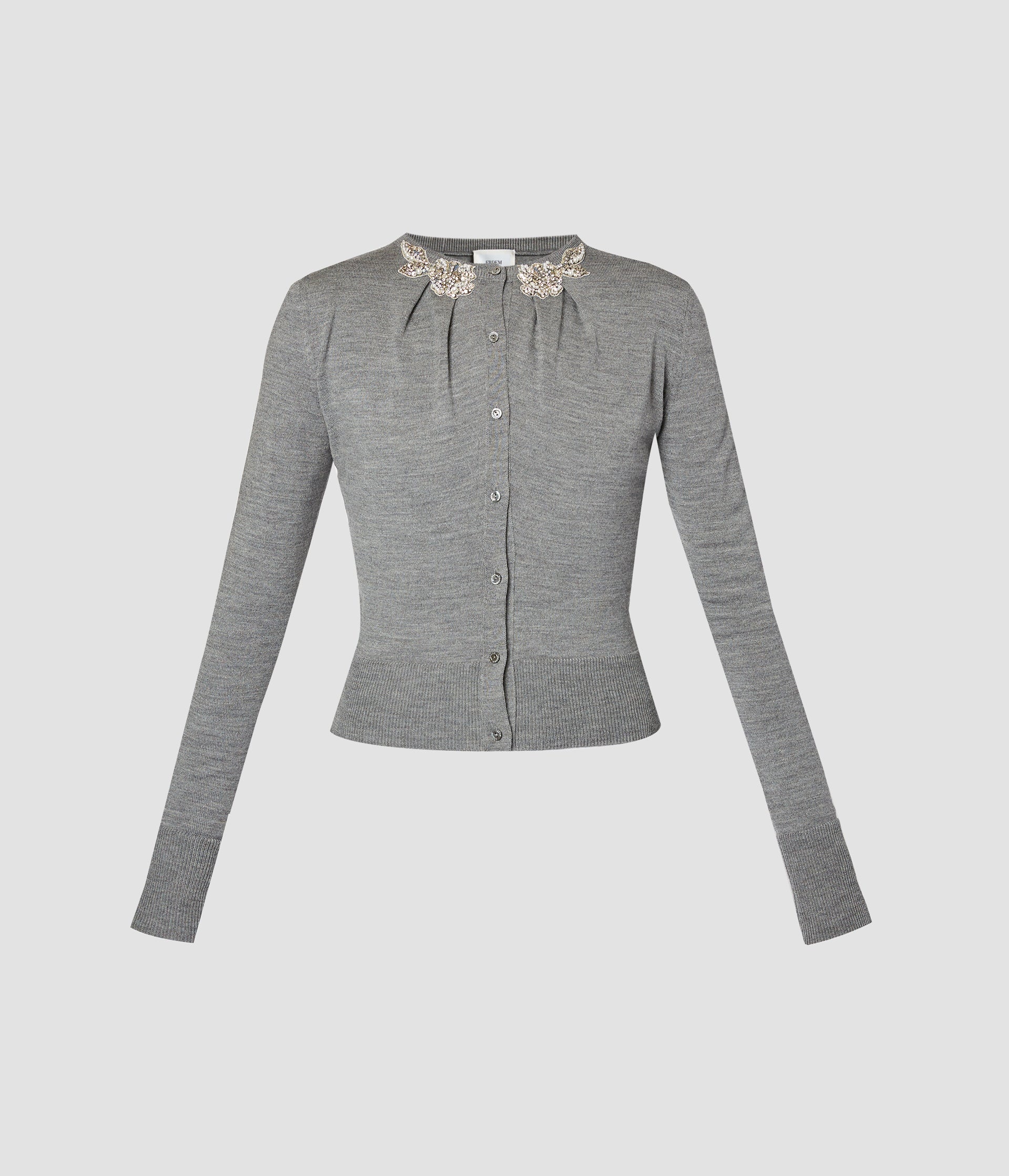 This grey cardigan is knitted from lightweight merino wool. Shaped for a close fit, its classic silhouette is enhanced by feminine draping and decoration at the collar. Wear it with everything from tailored trousers to printed skirts. Size and Fit This cardigan has a crew neck with draped detailing, long sleeves, and ribbed trims. It button fastenings through the centre front. Fits true to size. Model is 5'10" and wears a size UK 6. Fabric and Care 100% Wool. Embroidery: 60% Glass, 20% Brass, 20% Copper. Do Not Machine Wash / Delicate Dry Clean / Do Not Bleach / Do Not Tumble Dry / Cool Iron On Reverse.