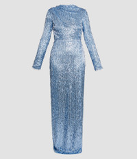 With a draped neckline and floor-length hem, this blue gown is covered in thousands of sequins and bugle beads. - Slim silhouette - Fully lined - Floor length - High neckline - Long sleeves - Centre back vent - Centre back hook, eye, and concealed zip fastenings - Product code: AW25_G44_50654013 Fits true to size. Model is 5'11 (180cm) and wears a size UK 8. Fabric and Care 95% Polyester, 5% Spandex. Lining: 100% Silk. Dry clean.