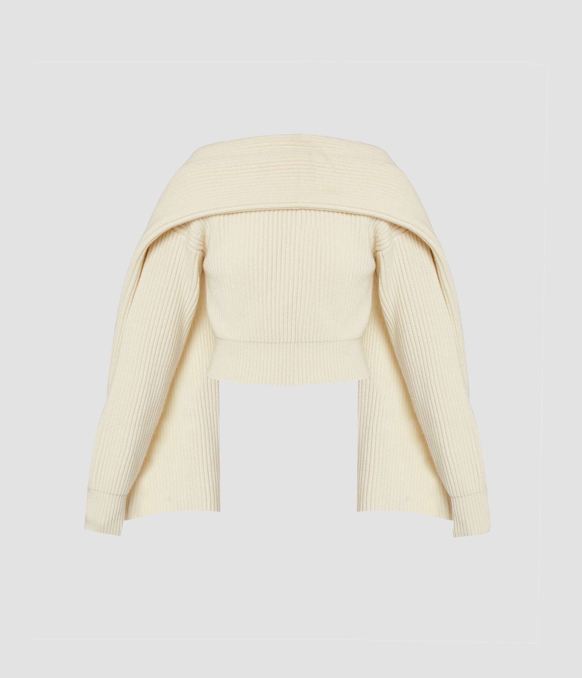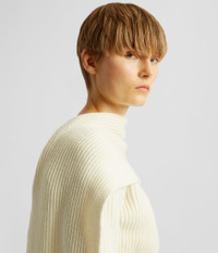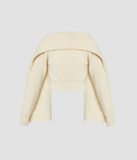 Clever draping is a key theme for AW24, and here the aesthetic is translated into knitwear. This cropped, rib-knit jumper is spun from a blend of wool and cashmere in a classic shade of cream. It features an oversized, detachable scarf, long sleeves, and a fitted waistband. Play with proportions by teaming it with a sleek pencil skirt. Size and Fit Model is 5'10" and wears a size UK 6. Fabric and Care 70% Wool, 30% Cashmere. Do Not Machine Wash / Delicate Dry Clean / Do Not Bleach / Do Not Tumble Dry / Cool Iron On Reverse.