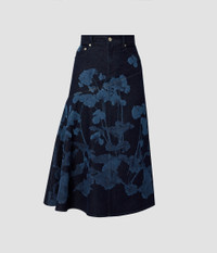 ERDEM reimagines the denim skirt in this romantic iteration. Designed with an asymmetric panel, this feminine silhouette showcases the season’s Elena Garden design as a selvedge border. The blue flowers are laser printed onto indigo denim for a unique finish. Fits true to size. If in between sizes, recommend sizing up. Size and Fit This mid-length skirt has an asymmetric hem. It has belt loops at the waist and two slant pockets, a coin pocket, and two back patch pockets. It has centre front button and zip fly fastenings. Fits true to size. If in between sizes, recommend sizing up. Model is 5'9" / 175cm and wears size UK 6. Fabric and Care 100% Cotton. Dry Clean.