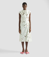 This dress has a fitted bodice, and a loose, draped skirt. It is made from white textured satin which is decorated with a print inspired by the curious mind of the German naturalist, Maria Sibylla Merian. It features an array of butterflies, bugs and small flowers, unevenly scattered across the fabric. - Draped silhouette - Fully lined - Midi length - High neck - Sleeveless - Side split - Centre back hook, eye, and concealed zip fastenings - Product code: PS26_D100P_51159002 Fits true to size. Fabric and Care 94% Polyester 6% Metal. Lining: 100% Silk. Dry clean.