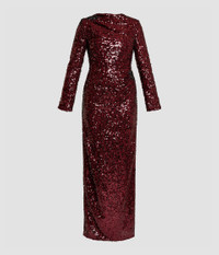 Covered in scores of ruby-red sequins, this gown is fitted through the body and falls to a slim, floor-length skirt. It has black crystal-embroidered appliques at the gathered shoulder and hip. - Slim silhouette - Fully lined - Floor length - High neckline - Long sleeves - Centre back split - Centre back hook, eye, and concealed zip fastenings - Product code: HO26_G9_50566001 Fits true to size. Fabric and Care Main: 100% Polyester. Secondary: 100% Polyamide. Sequins: 100% PET. Lining: 75% Acetate, 25% Silk. Embroidery: 40% Brass, 40% Glass, 20% Nylon. Dry clean.