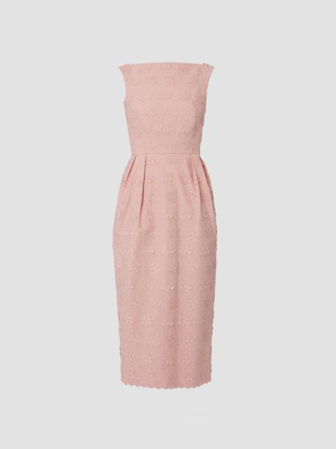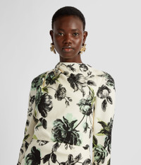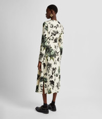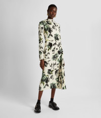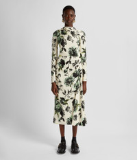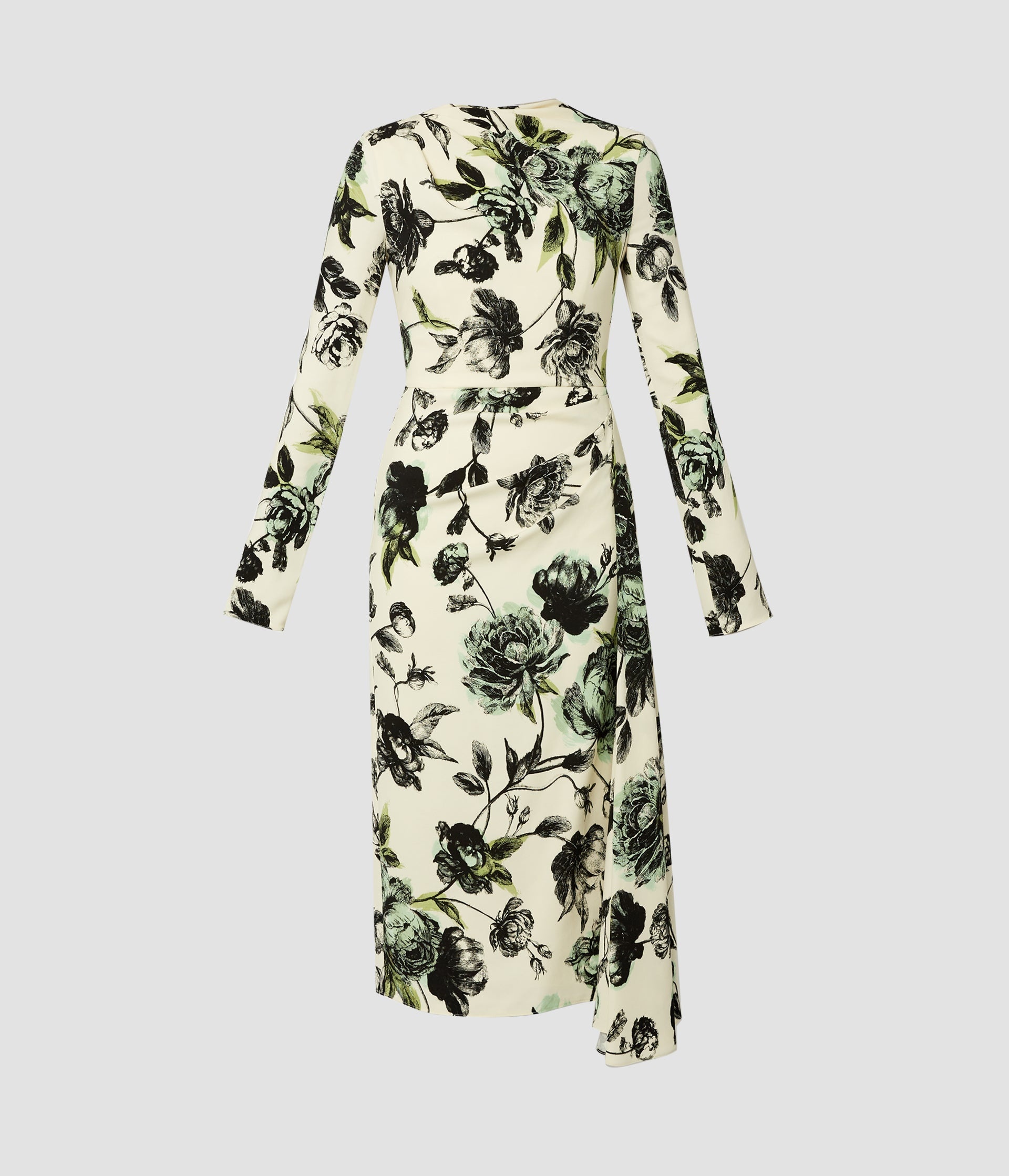 Cut from stretch cady, this mid-length dress is draped at the hip and falls to an asymmetric hem. The figure-skimming fabric is decorated with the Violetta Etching print, designed to create a toile de jouy effect. It is made up of trailing peony etchings from the 1600s. Size and Fit This mid-length dress has a high, draped neckline, long sleeves, and a fitted waist. It has a draped skirt. It has a centre back zip fastening and is fully lined in ivory stretch crepe de chine. Fits true to size. Fabric and Care 97% Viscose, 3% Elastane. Lining: 94% Silk, 6% Elastane. Dry Clean.