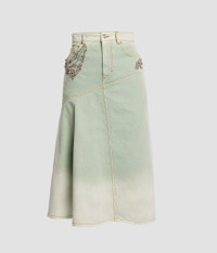 This mint denim skirt features a sun-faded effect. Shaping an A-line silhouette, its asymmetric design is embroidered with crystal embellishment. Relaxed silhouette Lined at pockets Midi length A-line hem Centre front button and zip fly fastening Front side and coin pockets, back patch pocket Product code: SS25_DES3_GED Fits true to size. If in between sizes, recommend sizing up. Fabric and Care 100% Cotton. Embroidery: 62% Glass, 25% Brass, 10% Nylon, 3% Polyester. Dry clean.