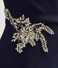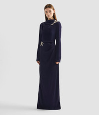 Draped from midnight sable, this floor-length gown cuts a streamlined silhouette while crystal embroidery punctuates the shoulder and hip. - Slim silhouette - Fully lined - Floor length - High neck - Long sleeves - Back vent - Centre back hook, eye, and concealed zip fastenings - Product code: PS26_G9_50994014 Relaxed fit. For a closer fit, recommend sizing down.Model is 5'9 (175cm) and wears a size UK 8. Fabric and Care 96% Viscose, 4% Elastane. Lining: 100% Silk. Embroidery: 85% Glass, 15% Brass, 5% Polyester. Dry clean.