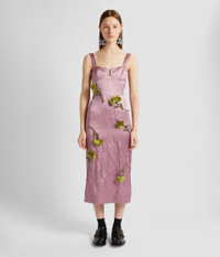 Showcasing a keen attention to craftsmanship, this slim-fitting dress is made from subtly textured, pink duchesse satin. It is embellished with green hand-embroidered carnations, inspired by the one worn by Oscar Wilde. Three-dimensional fabric petals are cut and treated by hand, lending the flowerheads volume. Meanwhile, the stems are decorated with tiny glass beads. The bustier-style bodice features a cutout detail for added allure. Size and Fit This mid-length dress has a bustier-style bodice with V-neckline, and a centre back vent. It has a centre back zip fastening and is fully lined in anemone silk crepe de chine.Fits true to size. Fabric and Care 56% Viscose, 37% Cotton, 7% Metallic. Lining: 100% Silk. Embroidery: 3D Petal: 34% Viscose, Beads: 33% Glass, 33% Brass. Dry Clean.