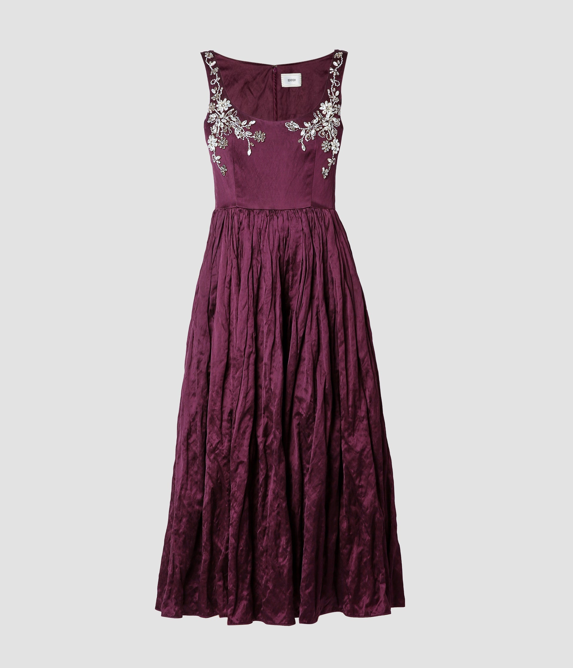 This dress is cut from crushed satin in a rich merlot hue. Drawing the eye to the flattering scooped neckline, it is intricately hand embroidered with delicate floral motifs using faceted stones. A cinched waist and full skirt furthers a feminine mood. Size and Fit Model is 5'10" and wears a size UK 8. Fabric and Care 56% Viscose, 37% Cotton, 7% Metal. Lining: 75% Acetate, 25% Silk. Do Not Machine Wash / Delicate Dry Clean / Do Not Bleach / Do Not Tumble Dry / Cool Iron on Reverse.