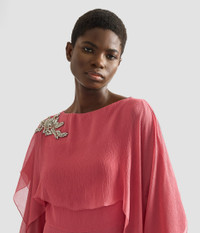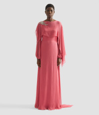 Cut from cherry silk creponne, this gown features blouson sleeves and a fluid, draped overlay. It is embellished with crystals at the shoulder and falls to an asymmetric hem. - Asymmetric silhouette - Fully lined except for sleeves - Floor length - Straight neck - Blouson sleeves - Asymmetric hem - Centre back hook, eye, and concealed zip fastenings - Product code: PS26_G57_50946004 Fits true to size. Fabric and Care 100% Silk. Lining: 73% Acetate, 27% Silk. Dry clean.